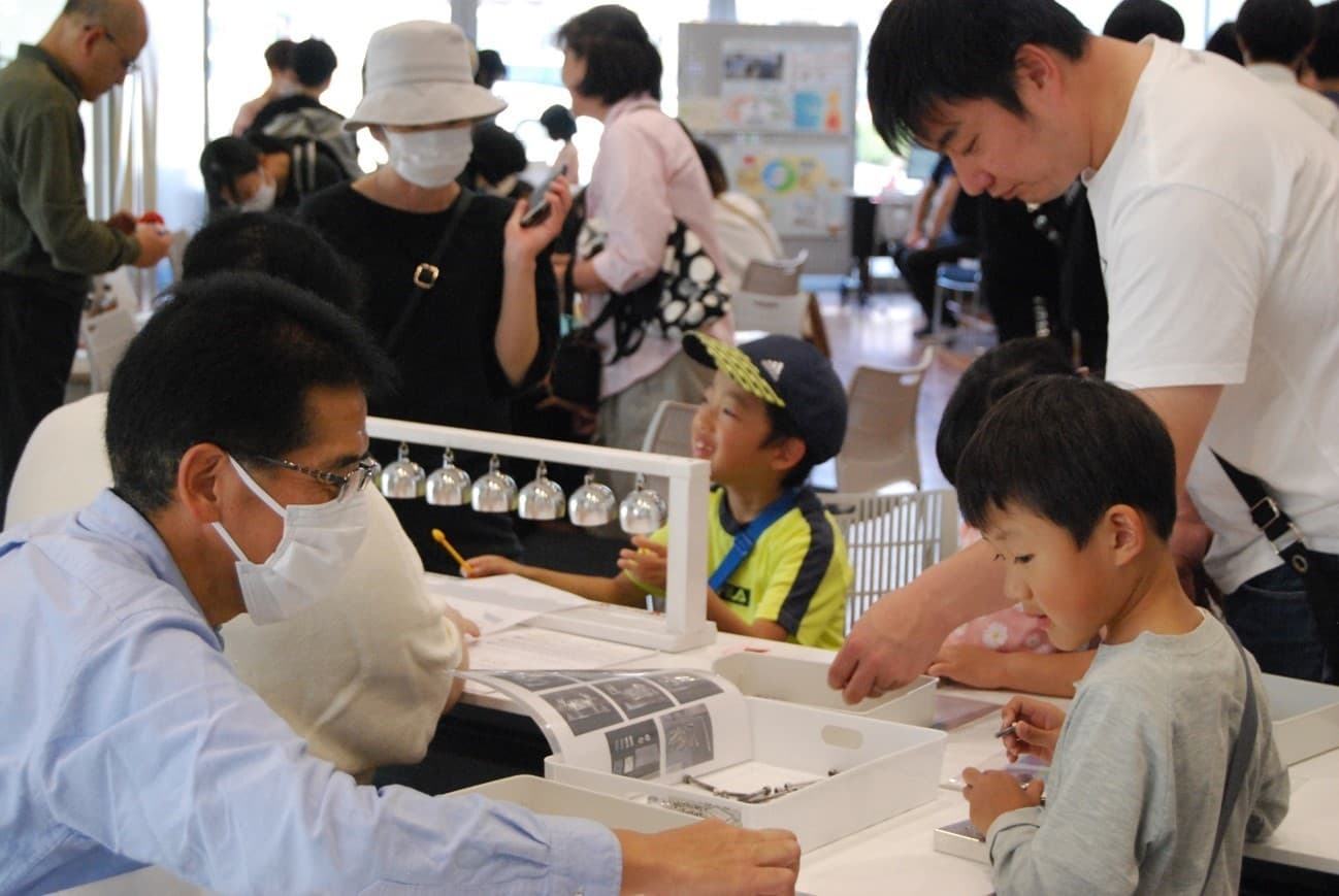 アルミという素材に触れ、ものづくりの面白さに触れてもらうため、パズルや風鈴など見て触って体験できるアルミ商品を用意。来場者はアルミの触感や奏でる音色を楽しみました。